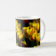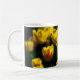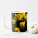 Flores de tulipas de cor amarela e vermelha em um leito floreado. Brincar de luz solar e fundo verde escuro. As tulipas parecem velas queimadas. A tulipa amarela significa esperança, alegria e sorriso brilhante e enigmático.