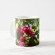 Caneca de café das flores e da palmeira. A caneca original tem flores cor-de-rosa escuras sob a máscara de uma palmeira.