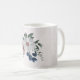 Linda caneca de café botânica apresentando flores rosa romântico, branco e azul marinho com folhas verdes.