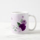 Caneca de café romântica e bonita com flores roxas e algumas folhas verdes .