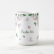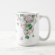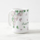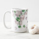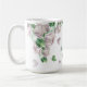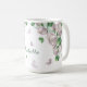 flores roxas sonhadoras românticas e folhas verdes com belas borboletas caneca de café botânica.