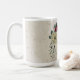 Caneca de café única e bonita com flores românticas vermelhas e amarelo pálido e folhas verdes.