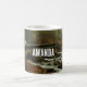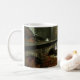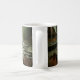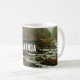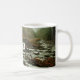 Uma caneca com uma fotografia da natureza. Paisagem magnífica e bonita. Uma ponte de pedra isolada ao lado de um rio vivo com uma floresta e montanhas ao redor da área.