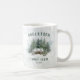 Esta caneca personalizada da família apresenta uma cena de aquarela rústica de uma cabana aninada na floresta, com pinheiros cobertos de neve.