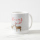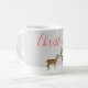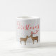 Celebre a magia da época de festas com esta encantadora caneca Feliz Natal com uma cena pacífica de cervos na floresta. O fundo suave coberto de neve, a elegante escrita em caligrafia vermelha e o design minimalista de inverno criam uma aparência aconchegante e festiva perfeita para o Natal.