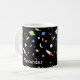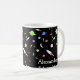 Uma caneca decorada com foguetes, estrelas, luas e planetas coloridos. Personalize com o nome de sua escolha. Excelente para futuros astronautas.