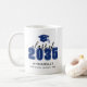 Uma caneca de formatura elegante e moderna com um ícone de um chapéu de formatura no topo em azul, com “Turma de” e o ano exibidos logo abaixo. O nome do graduado e da escola aparecem abaixo em fontes limpas e elegantes, criando um design sofisticado e elegante. O design envolve a caneca em dois lados, garantindo que ela tenha uma ótima aparência de todos os ângulos.