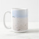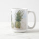 Uma caneca com uma fotografia com um par de abacaxi sentado numa praia arenosa.