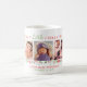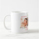 Personalize este café festivo de "Feliz de Natal" ou uma caneca de cacau quente com fotos favoritas do seu novo bebê, nome e data de nascimento. Uma borda de feriado floral de colly, bagas, folhas, pinecones e galhos enquadra suas três (3) fotos favoritas de recém-nascidos. Esquema de cores: branco com vermelho, roxo empoeirado, verde, castanho e azul-aqua úmido.