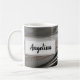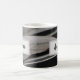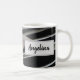 Uma foto de penas de pato enfeita esse chá matinal personalizado ou uma caneca de café criando faixas horizontais de penas. As penas das aves pretas e cinzas acrescentam um toque de natureza e um elemento abstrato único a esta caneca moderna. Seu nome aparece dentro a um retângulo de cinza leve em ambos os lados desta caneca. Personalize rápida e facilmente.