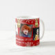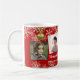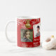 Bonito caneca de Natal vermelha e dourada com quatro modelos de fotos e duas linhas de texto personalizado. Preencha com fotos das crianças e dê a um pai, ou dê a avós. Flocos de neve brancos caem sobre o fundo com pequenos ornamentos de árvores de ouro pendurados no topo.