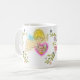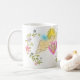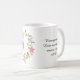 Uma caneca super fofa mostra um anjo em coroas florais segurando uma foto em forma de coração. Quem me traz a mãe? E anjo, minha querida!