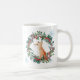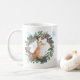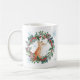 Uma raposa fofa senta-se dentro a coroa de Natal, cercada por flocos de neve delicados.