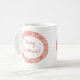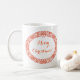 Uma caneca de café de Natal para personalizar com uma coroa de Natal de sagrado, marife, poinsettias, cones de abeto e esprigs de abetos. Esta coroa de Natal desenhada à mão está em Vermelho Brilhante num fundo branco que se pode mudar, se quiserem, com "Feliz Natal" também em Vermelho, que também se pode mudar.