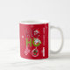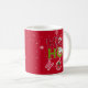 Funny HO HO HO Retro Natal Holiday Coffee Mug apresenta uma tipografia manuscrita retrô "HO HO HO" com personagens de desenho animados de Natal: Papai Noel, Neves e Urso de Peste, isolada sobre fundo vermelho com flocos brancos de neve. *** Clique no botão editar/personalizar para personalizar este design com seu texto ou nome pessoal. Feliz Feriados!