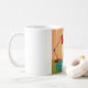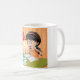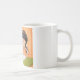 Uma garota sentada em uma mesa trabalhando com uma pilha de livros. Esta design parece realmente eficaz nesta Mug