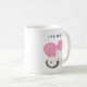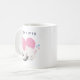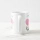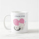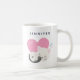 Uma caneca com uma ilustração gráfica adorável. Um gatinho branco com uma imagem de pegada de pata na pelagem. Dormindo em paz. Um grande coração rosa atrás dela e algumas estrelas também.