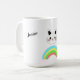 Um desenho bonito e colorido de uma cara de gato flutuando sobre um arco-íris.