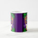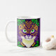 Uma caneca de café na imagem de um gato bonitinho enfeitiçado numa máscara nas cores festivas de Mardi Gras. A mistura de roxo, verde e amarelo ouro reflete as tradicionais matizes da celebração