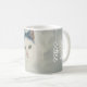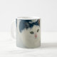 Travesseiro decorativo "A amizade vai mantê-lo quente no inverno". Gato branco e preto com nariz de rosa na neve fresca para amantes de estimação. Altere o texto ("Café de erva") para qualquer ocasião que desejar. Para mais modificações (estilo de fonte, cor de fonte, posição de texto), clique em "Editar design".