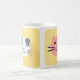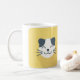Uma caneca de cerâmica clássica, com um gráfico simples e fofo do rosto de um gato feliz. A design mostra uma cabeça branca de gato com manchas escuras de cinza, uma boca sorridente e sussurros, colocados contra um fundo amarelo macio. Esta caneca é perfeita para café, chá, ou qualquer bebida quente, trazendo um toque de alegria para sua rotina matinal
