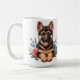 Um filhote German shepherd adorável rodeado de flores coloridas e uma borboleta, representando uma interação lúdica e quente da natureza, perfeita para temas de animais de estimação, amor e apreciação da natureza.