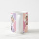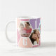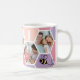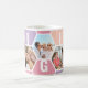 Caneca de café de mel, personalizada com 5 de suas fotos favoritas e impressa com um nome de 4 letras, como GIGI. A design apresenta uma colagem de fotos em favos de mel em uma paleta colorida de sorvete de verão de rosa lilás e pêssego, com uma abelha fofinha. Se quiser alterar as cores, clique em "personalizar mais" e clique em cada hexágono que deseja alterar.