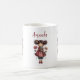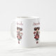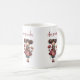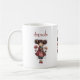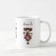 A mug with a cute retro image featuring a whimsical girl with rosy cheeks and flowers in her hair. Carrying a green frog doll.