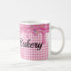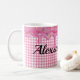 Pingindo gelo cor-de-rosa com borrifos doces sobre fundo de gingham rosa e branco. O texto pode ser editado ou excluído.