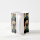 Retro-modern geometric abstract coffee mug featuring, bold circles, gold coloured accents, and rich tones on a distressed beige backdrop.