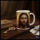 "This majestic and detailed graphic features a reverent portrait of Jesus Christ with soft, focused lighting and a gentle expression. The central image is magnificently framed by a rich, three-dimensional border of scrolling gold patterns and intricate floral motifs set against a deep navy blue or black background. This luxurious and detailed design is perfect for high-end religious home decor (such as art prints and posters), covers for deluxe prayer books or Bibles, celebratory greeting cards with a spiritual theme, commemorative medals or symbols, or any product intended to express faith and artistic appreciation with elegance and sophistication."