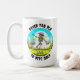 Uma caneca de café azul e verde com uma vibração retrô vintage apresentando um esqueleto em um disco de chapéu solar golfando na floresta com a citação: 'Nunca muito velho para jogar golfe.'