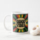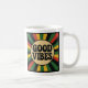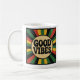Start your day with positive energy and style with this "GOOD VIBES" design on a vibrant mug. Featuring bold black typography surrounded by colorful red, yellow, green, and black stripes, this retro-inspired artwork brings a 60s psychedelic reggae vibe to your coffee or tea break. Perfect for those who love reggae music, vibrant colors, and a touch of vintage style with every sip.