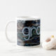 Esta caneca para avô apresenta padrões de abstrato de arte nas cores principais de azul, preto, cinza e tem "Grampy" escrito em azul.