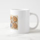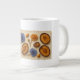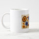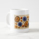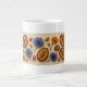 Mug with artistic print: halved plums, blue cornflowers, orange marigolds, and rose hips on a textured cream background. A warm, botanical composition full of color and harmony.