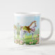 Uma ideia de presente de excelente para amantes de cavalos, este design branco com rosas cor-de-rosa pela artista Carolyn McFann certamente agradará, impresso numa caneca jumbo cerâmica durável e de qualidade. ©️ 2 Purling Cats Studio