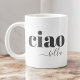 "Ciao Bella" é uma frase italiana que se traduz por "olá, bonito" em inglês. É comumente usada como uma saudação amigável, especialmente para as mulheres, expressando calor e admiração. Mostrada aqui na moderna tipogografia em minúsculas com um estouro de ponta na palavra bella para mais estilo e simples apelação mínima. A frase "ciao" é informal e versátil, significando "olá" e "adeus" em italiano, enquanto "bella" significa "bela" na forma feminina. Juntos, "ciao bella" encapsula uma forma casual, porém afetuosa, de saudar alguém de quem você gosta ou que acha atraente. Esta caneca faz uma ideia de presente de excelente para um amigo italiano, membro da família ou colega de trabalho.
