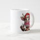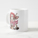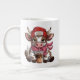 A cute cartoon cow sits sipping an iced coffee through a straw. She has brown and white spots, a pink scarf, and brown boots. On her head rests a red beanie with the words “Coffee Addict” written on it.