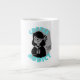 A imagem apresenta um design simples, mas surpreendente, de uma caneca de café sobre um fundo preto. A caneca tem ascensão de vapor dela, indicando que está cheia de café quente. Na caneca, há uma ilustração gráfica de uma pessoa segurando uma xícara, vestindo óculos, e um arco em seu cabelo. Por cima e por baixo desta ilustração, o texto "COFFEE ADDICT" é escrito em azul claro, ao redor do gráfico central. A design é limpa, com uma estética moderna e lúdica.