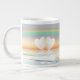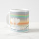 Uma grande caneca de café com uma imagem 3d de dois corações de papel flutuando na água sob um arco-íris. O texto personalizável diz "1 ano".