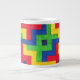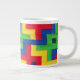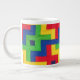Uma caneca colorida de tamanho grande para café ou sopa, em vermelho primário, azul, verde e amarelo, a partir de uma fotografia de uma manta de retalhos, feita à mão por Judy Adamson. Um bule de chá, Pitcher e outras canecas com esta design também estão disponíveis na minha loja.