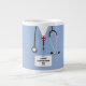 Caneca criativa de presente de formatura de médico com scrubs, estetoscópio e crachá de identificação. Para personalizar, edite o texto para adicionar o nome do médico e criar um souvenir colecionável.