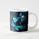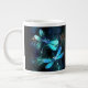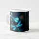 Duas libélulas transparentes, luminosas, turquesas, desenhadas artisticamente sobre fundo noturno, com algas e vagalumes luminescentes do lago. Dragonfly brilhante.