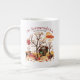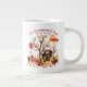 Cenário de outono e outono com uma antiga casa de fazenda assombrada e fantasma assombrados contra colinas rolantes de ouro e árvores de outono com sol amarelo ou lua com nuvens de laranja e guarda-chuva, criança com fantasia de Halloween, tela de cinema de terror assustada, pipoca, cartazes de cinema, abóboras de colheita, maçãs doces, cogumelos, folhas de outono, suéter de inverno e dando Wild ThanksTurquia. Leituras de texto: Estou pronto para cair