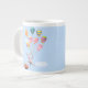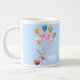 Uma caneca gigante de café com a minha trabalho de arte de um coelho a flutuar no céu enquanto segurava um monte de balões coloridos e uma cesta de ovos de Páscoa. O texto diz "Felz pascoa!"