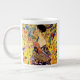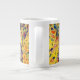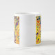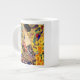 Café Mug com pintura de óleo de Gustav Klimt Lady com ventilador (1918). Uma mulher vestindo um quimono azul segura um fã vermelho contra um fundo amarelo colorido de flores e pavões. Um presente de excelente para fãs de arte japonesa e europeia.