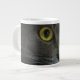 Um tiro na face de um gato cinza com olhos amarelos e pupilas dilatadas, descansando a cabeça sobre a pata e encarando intensamente algo atrás da câmera.