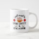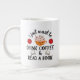 Uma caneca de café engraçada decorada com uma corrente de lâmpada e o ditado engraçado: Eu só quero beber café e ler um livro.