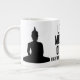 "Let Me Meditate On That (right after I finish my coffee) Buddhist humor quote mug. This jumbo coffee mug features two Buddhas sitting in lotus posture. It pairs a calm meditation image with a light humor twist that resonates with Buddhist practitioners who appreciate their coffee as much as their practice. A light hearted quip perfect for yourself or an office coworker, friend, or roommate who must have their morning brew before they sit and stew.