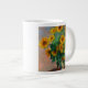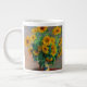 Café Mug que apresenta o Buquê de pintura de óleo de Girassóis de Claude Monet (1881). Lindos girassóis num vaso azul sobre uma mesa vermelha. Um presente de excelente para fãs do impressionismo e da arte francesa.